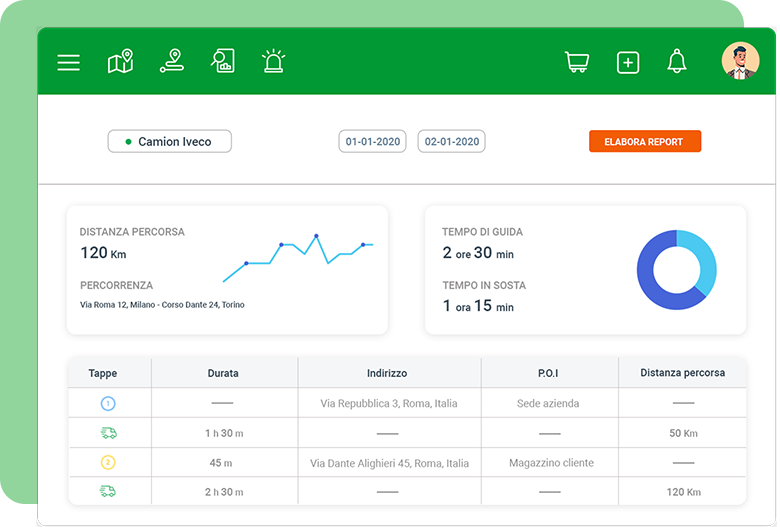 Per gestire al meglio la flotta, il Fleet Manager deve avere una chiara visione delle performance dei veicoli. Con il nostro software di gestione delle flotte questo è possibile grazie alla funzione di Report: tutti i dettagli delle percorrenze, i tempi in movimento o in sosta, la distanza percorsa e i dati dell' odometro GPS, vengono raccolti e sintetizzati in grafici e tabelle di facile e immediata comprensione. Un'analisi avanzata che sarà fondamentale per poter valutare nel complesso le prestazioni e l'efficienza della flotta aziendale. Le statistiche e i dati sono esportabili in formato Excel® con un solo click.